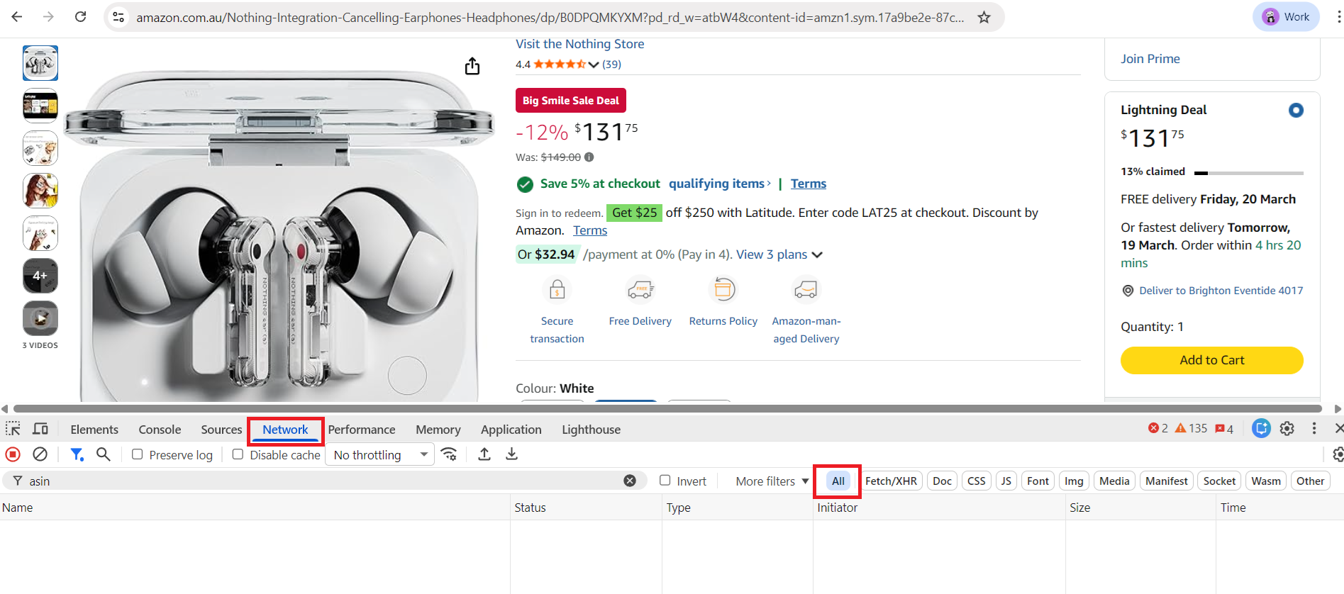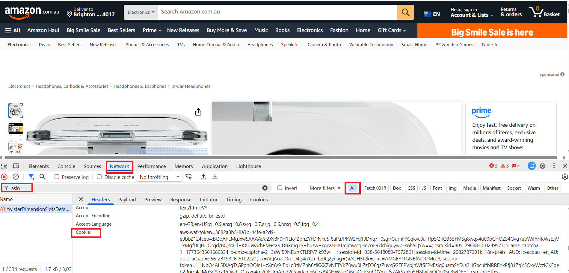 3. Go to your Amazon product URL and search for "asin" on that page within the Network tab. On the right side of the pane, you can see details about the request. Scroll to the Request Headers and copy the entire value of the header with the label Cookie.